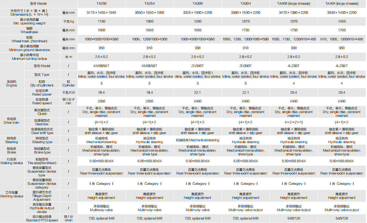 TA series tractor has compact structure and wide power range, which can bring you comfort and convenience, and meet your diverse needs. ◇The configuration of double clutch, double speed power output and spindle gear ensure comfortable operation and meet your different needs; ◇The tractor adopts brand new streamlined hood and car electrophoresis technology, which is artistic and durable. ◇Famous and excellent- quality engine, large torque reserve, better fuel economy |